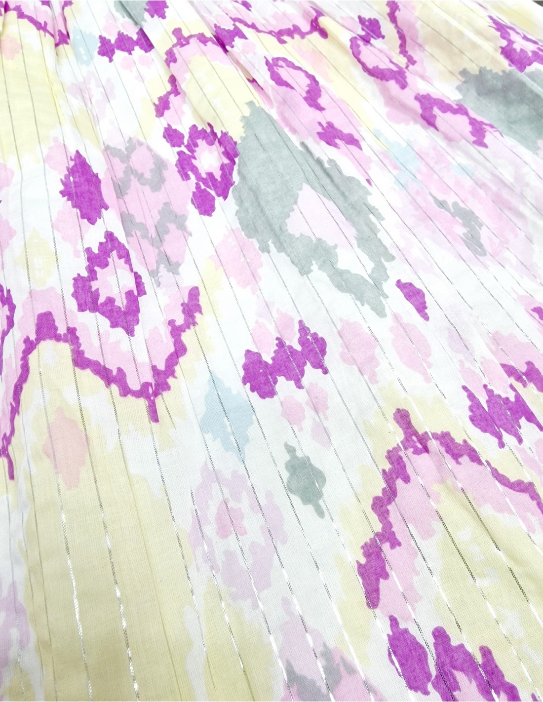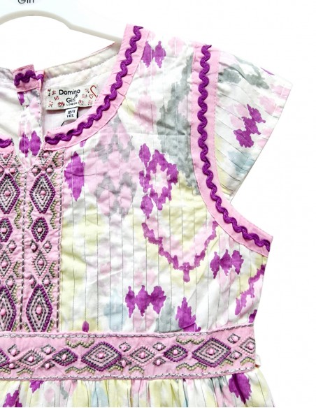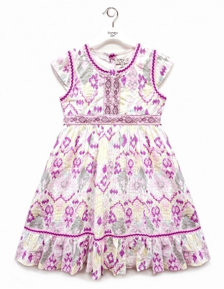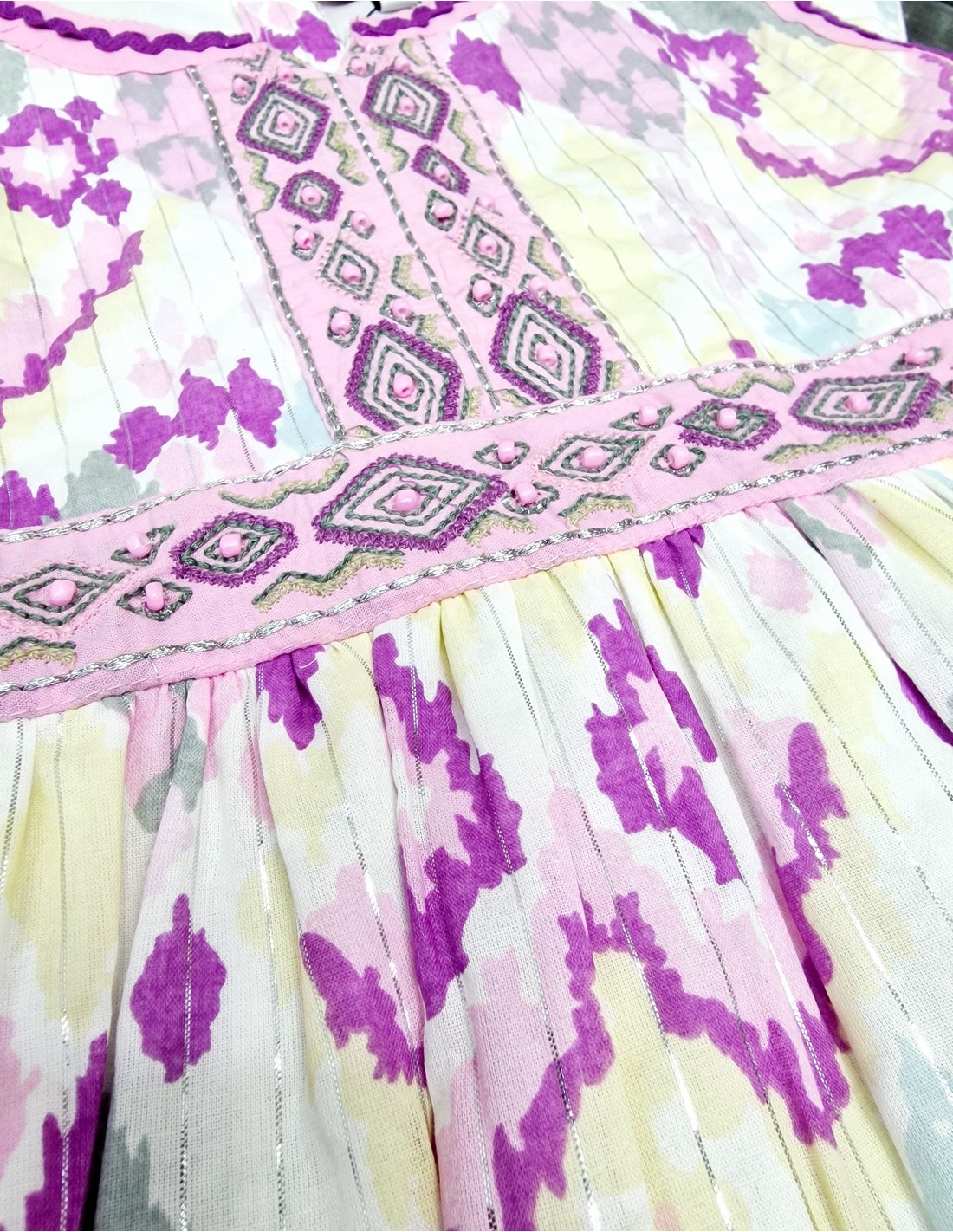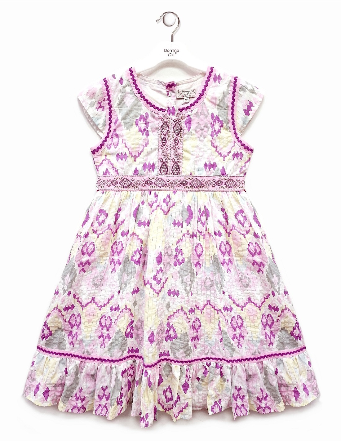 Perfect for summer, with a Lovely abstract print and lace trim hem, embellished bodice with colourful beads, classic round neck with a scallop lace detail, this dress offers the best of both worlds. Perfect for weekend wear or their best friend's birthday party.