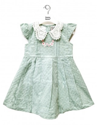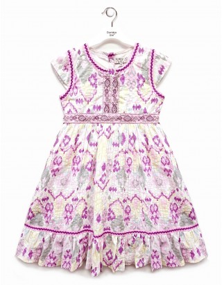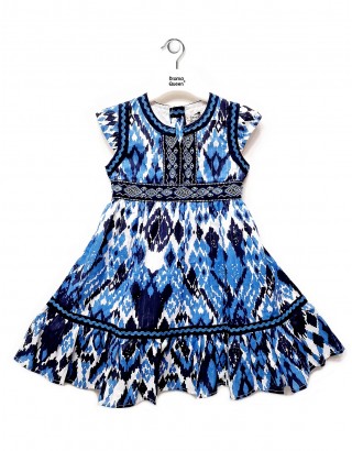 Perfect for summer, with a Lovely abstract print and lace trim hem, embellished bodice with colourful beads, classic round neck with a scallop lace detail, this dress offers the best of both worlds. Perfect for weekend wear or their best friend's birthday party.